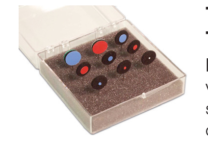 Flat test objects of various colors and sizes are mounted on non-reflective washable vinyl with a black felt background and pin shank for use with tangent screens.