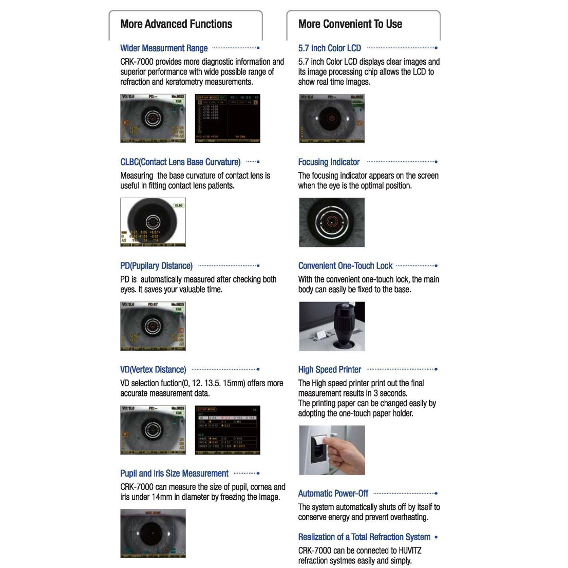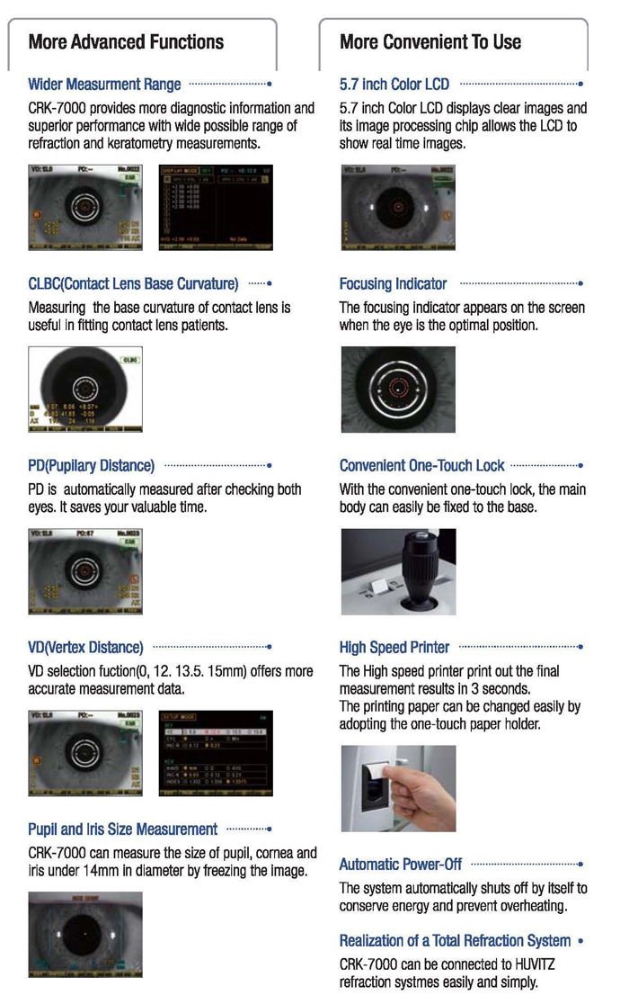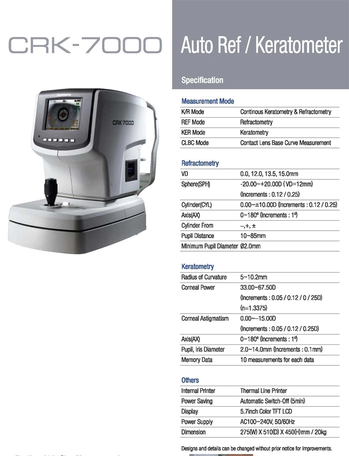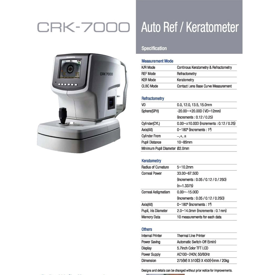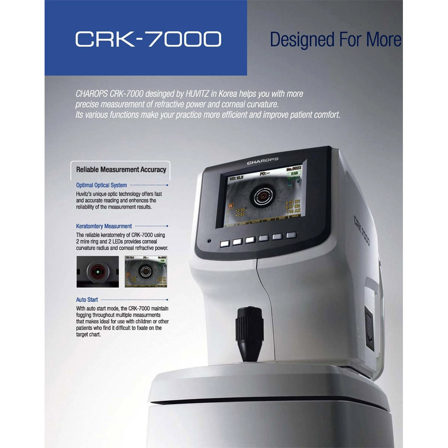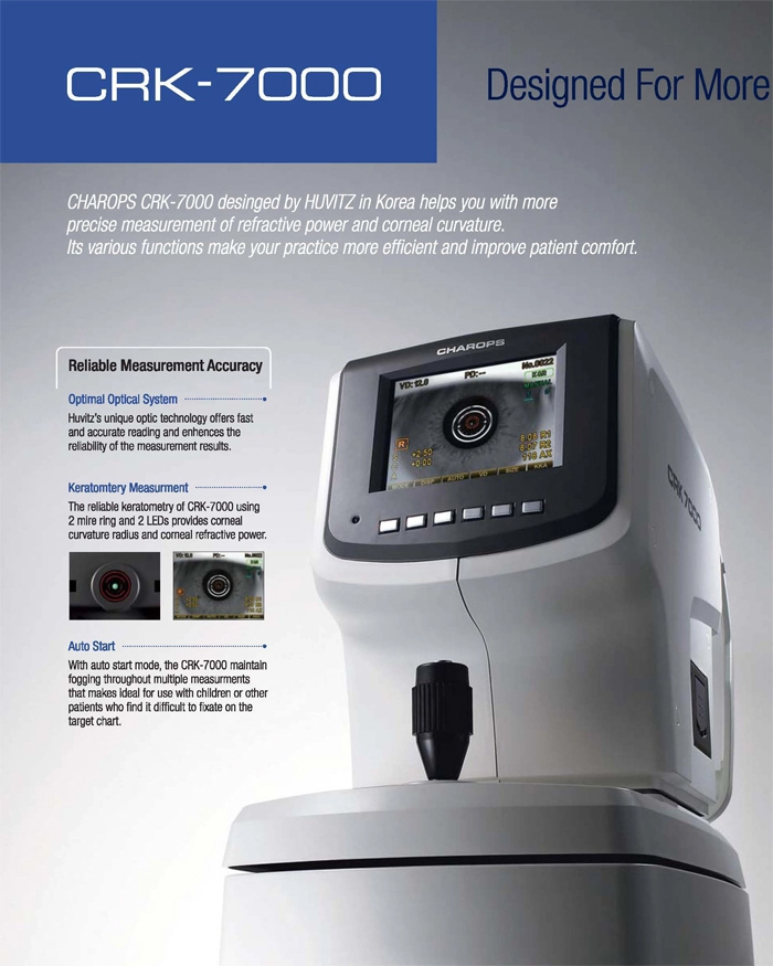 Charops CRK-7000 designed by Huvitz in Korea, gives a a more precise measurement of refractive power and corneal curvature. Its various functions will help make your practice more efficient and improve patient comfort.