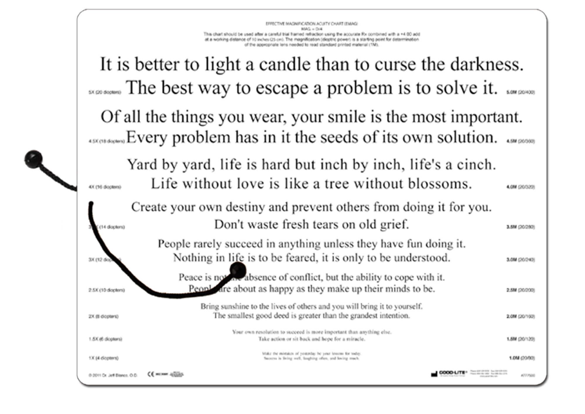 The EMAG Chart allows for easy determination of the starting dioptric power needed to read standard size print. The chart is used at 10" (25 cm) with a +4.00 add and gives the doctor or technician a uncomplicated approach for incorporating low vision in their practice. Acuity lines range from 20/400 to newspaper size print. The chart comes with instructions and has an attached measuring cord that ensures proper testing distance.