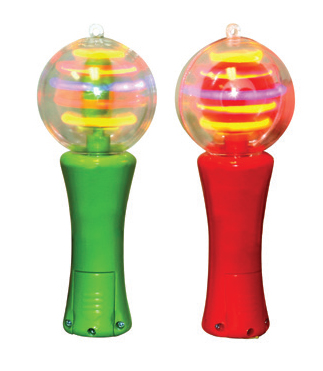 The Mini-Spinner is only 4" (10 cm) tall with a 1.5" (37 mm) globe where the blue, red and yellow LEDs spin. Light pattern changes as ball spins.