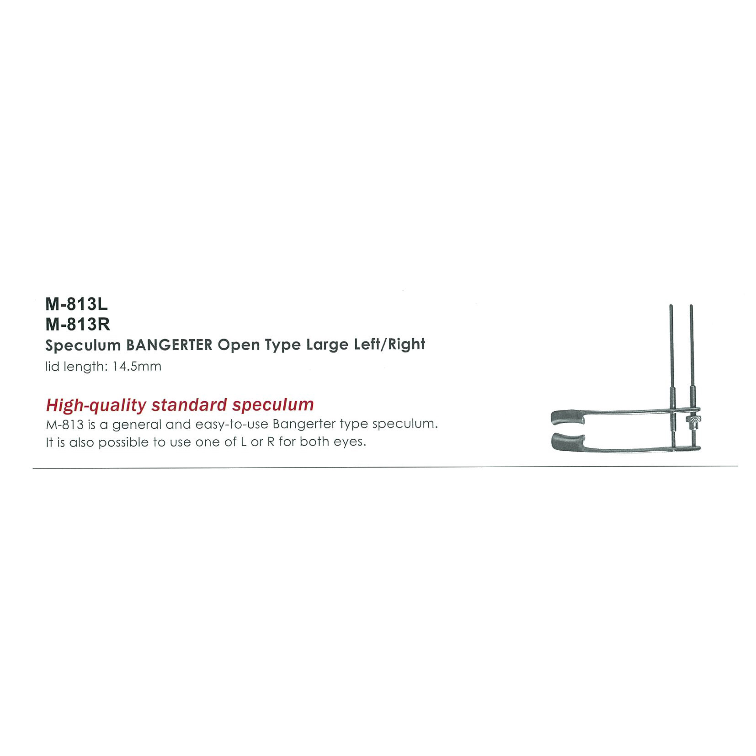 M-813 is a general and easy-to-use Bangerter type speculum. It is also possible to use one of L or R for both eyes.