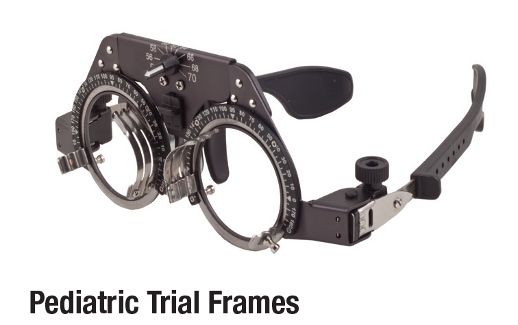 Pediatric spring-hinged trial frames are both lightweight and easy to use. PD can be adjusted from 54 mm to 70 mm and accommodates up to four 38 mm trial lenses on each side. Also contains axis of astigmatism and one touch adjustment on nose pad.